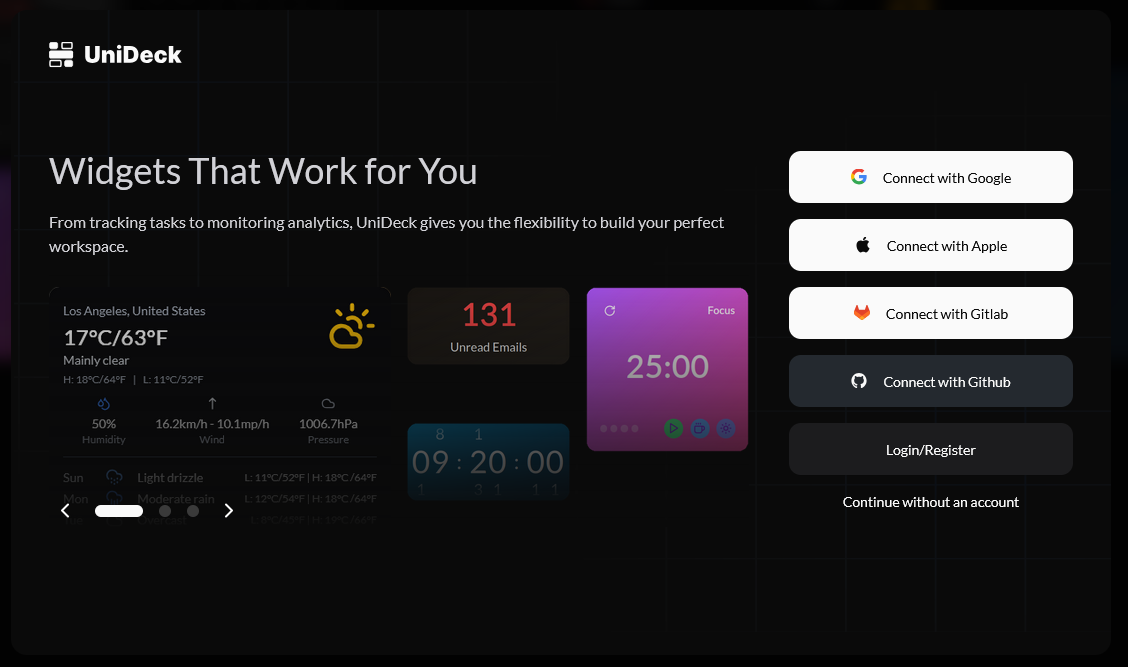 To unlock the full power of UniDeck, including saving your dashboards, syncing across devices, connecting integrations, and accessing advanced widgets, you’ll need an account.